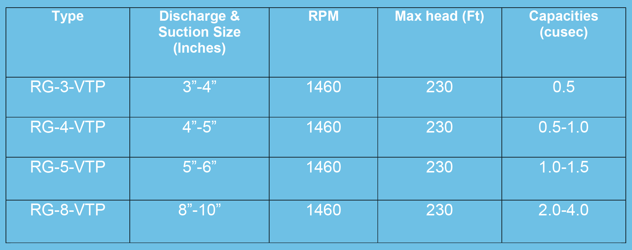 Different Types, Flow Capacities (cusec) and Head (Feet).